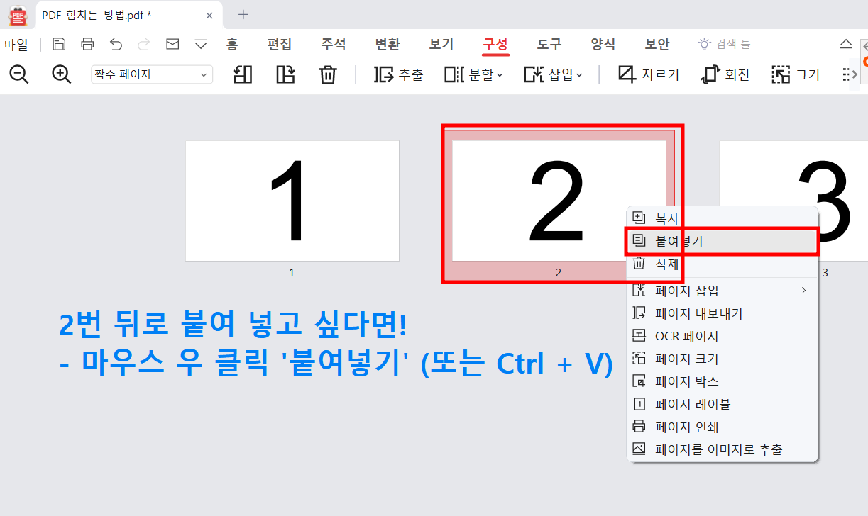 - 원하는 공간에 '붙여넣기' (1페이지 뒤로 붙이고 싶다면 1페이지 클릭 후 '붙여넣기'!
