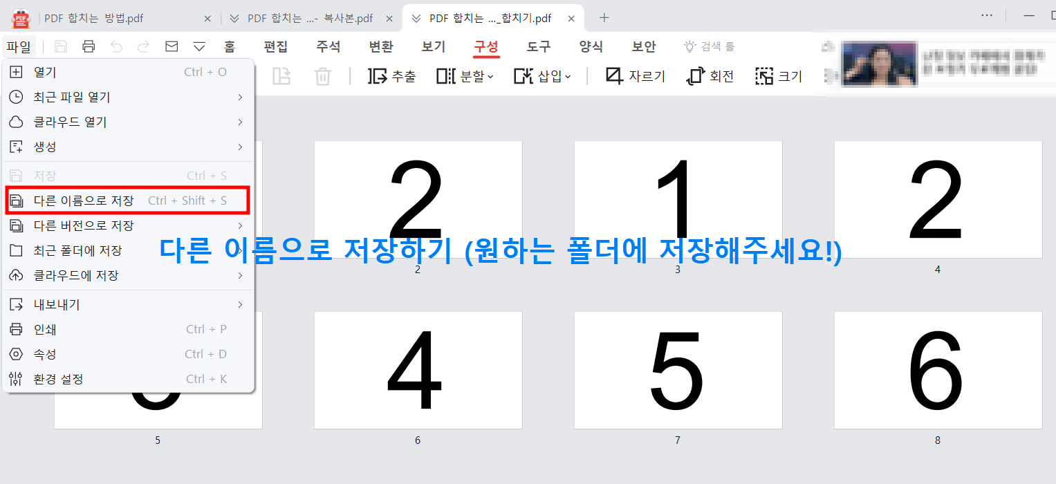 '적용' 후에 의 모습입니다. 기존의 1,2,3번의 숫자가 포함된 PDF 파일과 4,5,6이 있는 또다른 PDF 파일이 합쳐진 것을 확인 할 수 있습니다. 이 방법은 여러 개의 파일을 선택하면 모두 합쳐서 만들 수 있는 장점이 있습니다.
