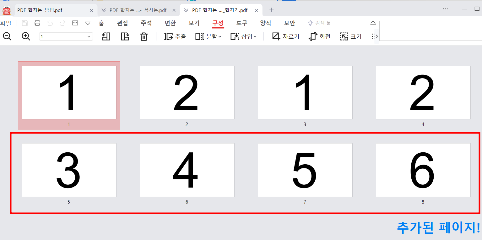 이 방법은 다른 두 개의 PDF 파일을 열은 후에 '구성' 메뉴로 가서 모든 페이지를 선택(단축키 Ctrl + A)을 한 뒤 복사한 후 또 다른 PDF 파일의 '구성' 탭으로 가서 위와 같은 방법으로 모든 페이지를 붙여넣을 수 있습니다.