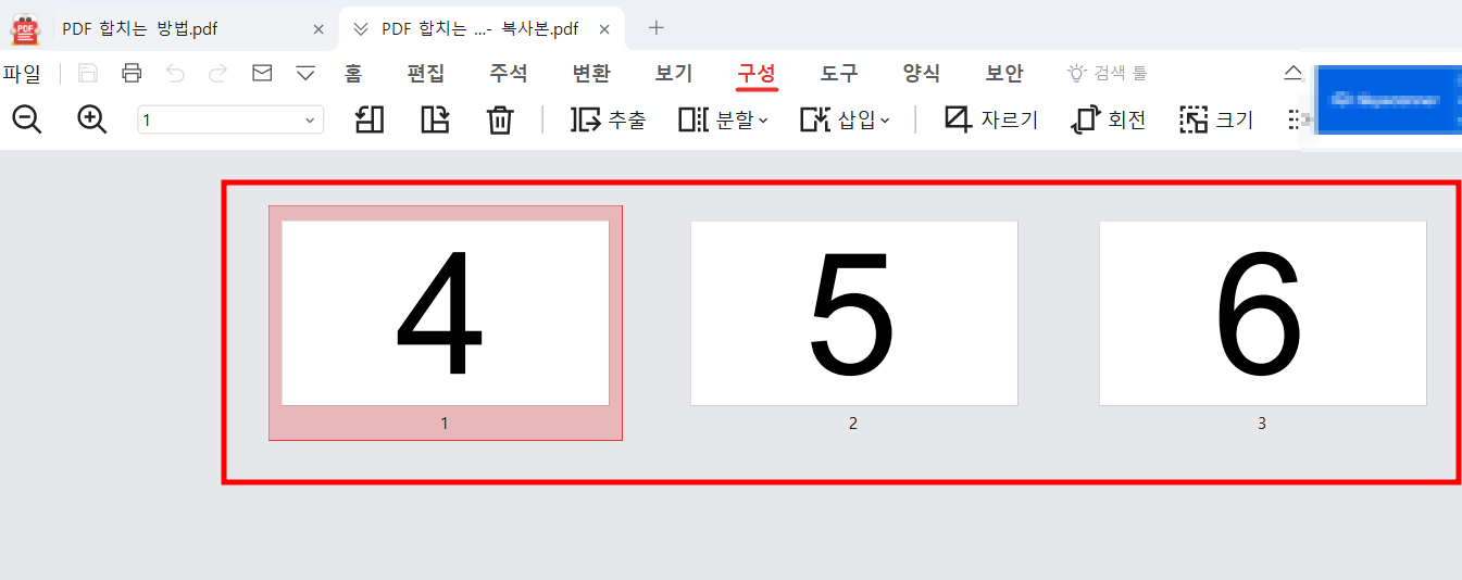 '적용' 후에 의 모습입니다. 기존의 1,2,3번의 숫자가 포함된 PDF 파일과 4,5,6이 있는 또다른 PDF 파일이 합쳐진 것을 확인 할 수 있습니다. 이 방법은 여러 개의 파일을 선택하면 모두 합쳐서 만들 수 있는 장점이 있습니다.