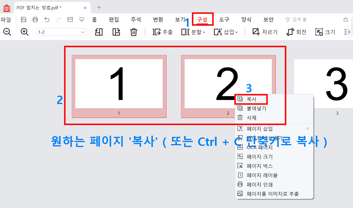 먼저 PDF 파일을 열고 위 사진에 따라서 1번 구성, 2번 원하는 페이지 선택, 3번 복사 단계를 순서대로 진행합니다.